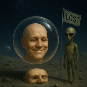 The LO$T flag flaps silently on this lunar wasteland.