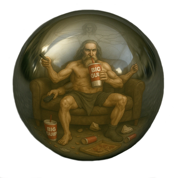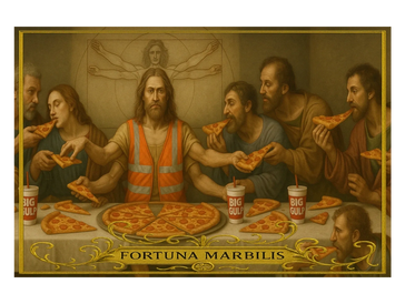 In a divine fusion of symmetry and satire, Vitruvian Cheesus serves up slices of cosmic wisdom and greasy truth. Clad in a hi-vis vest of enlightenment, he breaks pizza with his disciples beneath the gaze of Da Vinci’s sacred geometry.